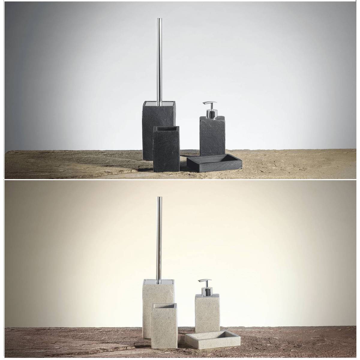 Il prezzo indicato si riferisce al set di accessori da appoggio SYL composto da 1 porta sapone, 1 porta spazzoli, 1 dispenser, 1 posta scopino di colore ardesia o sabbia (a scelta)