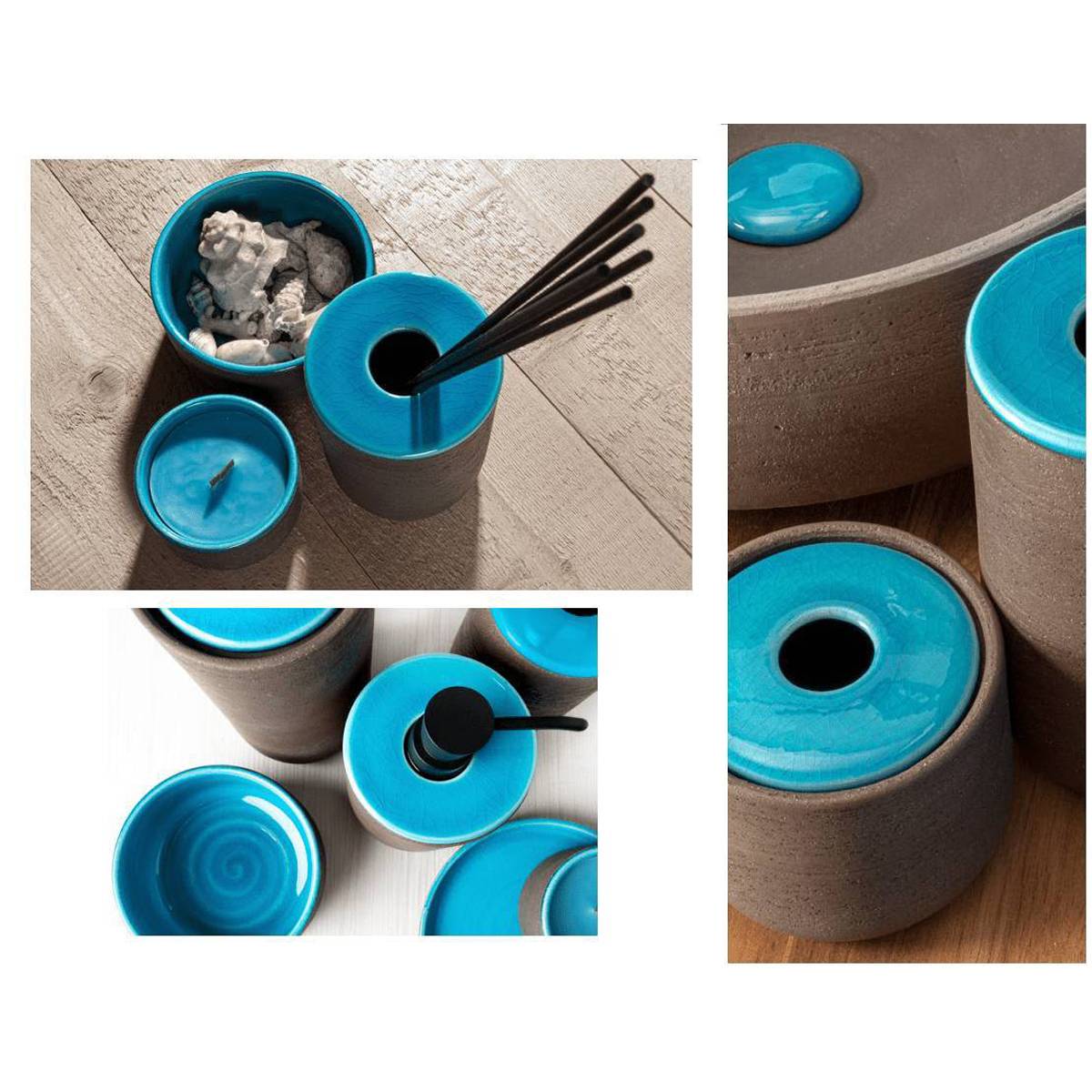 Set da bagno INDEX in argilla refrattaria naturale e smalto lucido colorato, composto da 4 pezzi: porta scopino, dispenser, bicchiere e porta sapone. Lavorazione artigianale Made in Italy.
