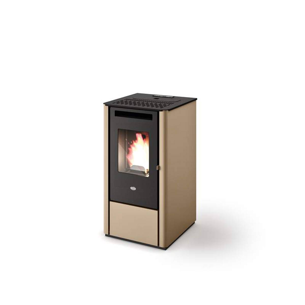 Stufa a pellet cad aria calda ventilata rivestita in acciaio verniciato.