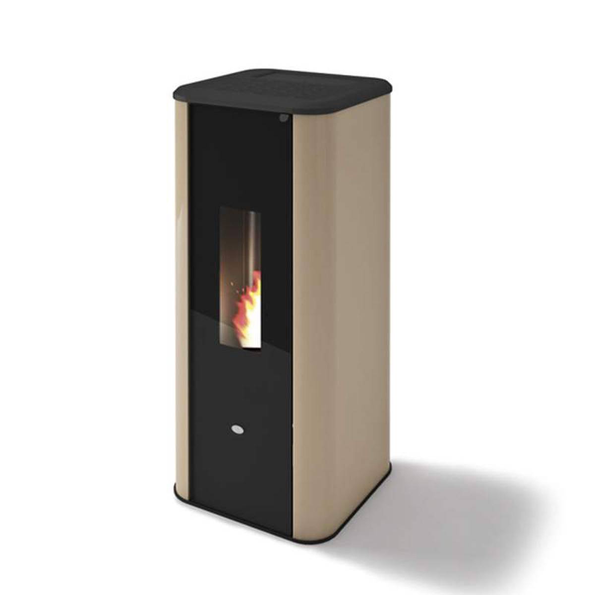 Stufa a pellet ermetica a convezione naturale con possibilità di attivare la ventilazione forzata con top in ghisa, dopoia porta e frontale porta in vetro serigrafato nero.