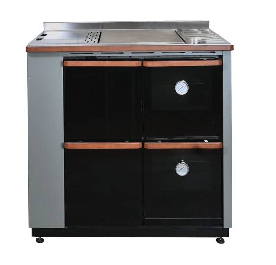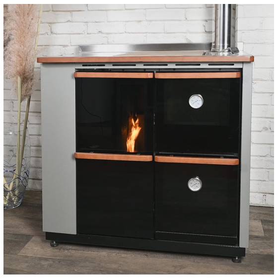 Offre tutto il necessario in un solo corpo: piano cottura in acciaio inox, forno incorporato e scaldavivande superiore. Tutto gestito in modo completamente autonomo, con una combustione a pellet controllata solo dal tiraggio del camino.