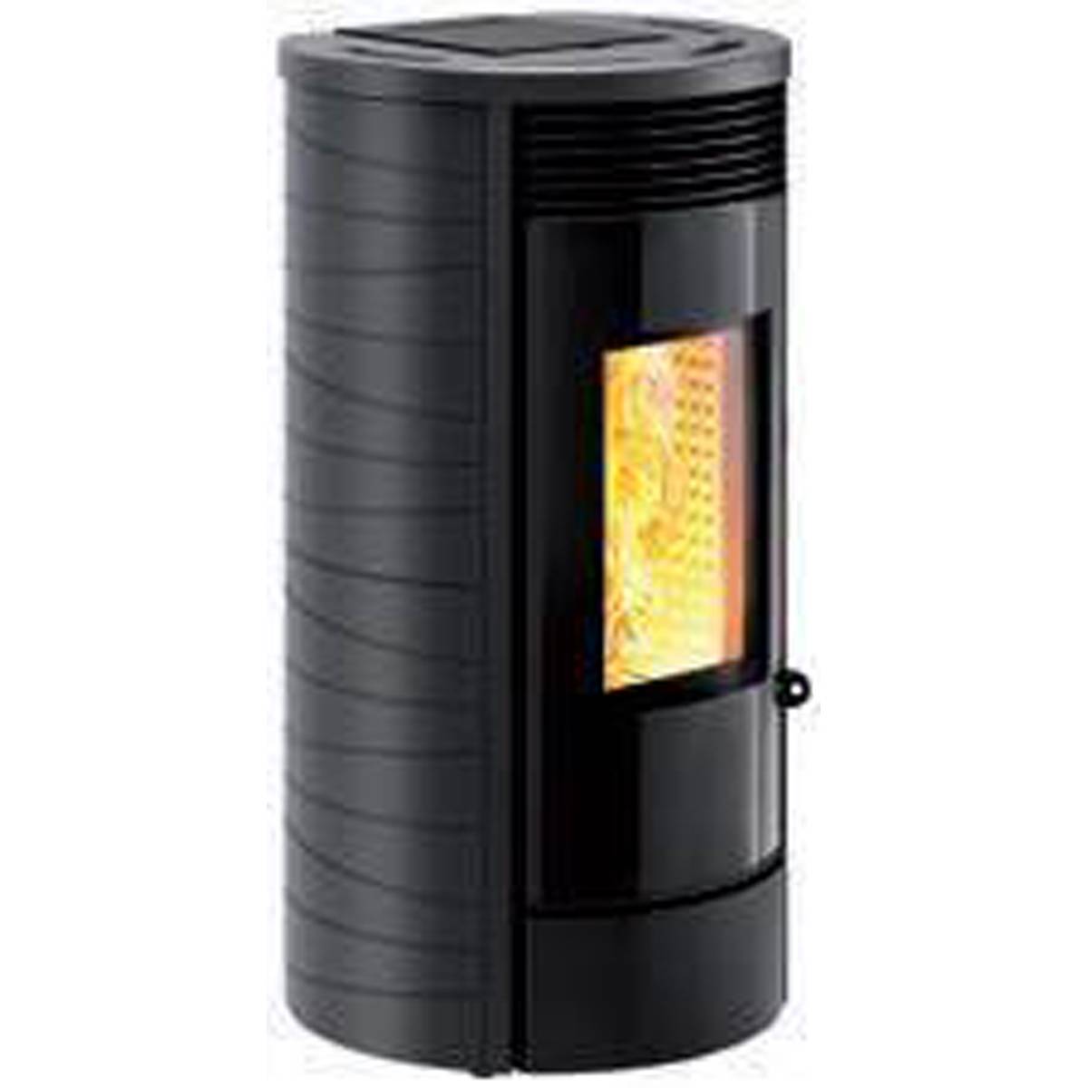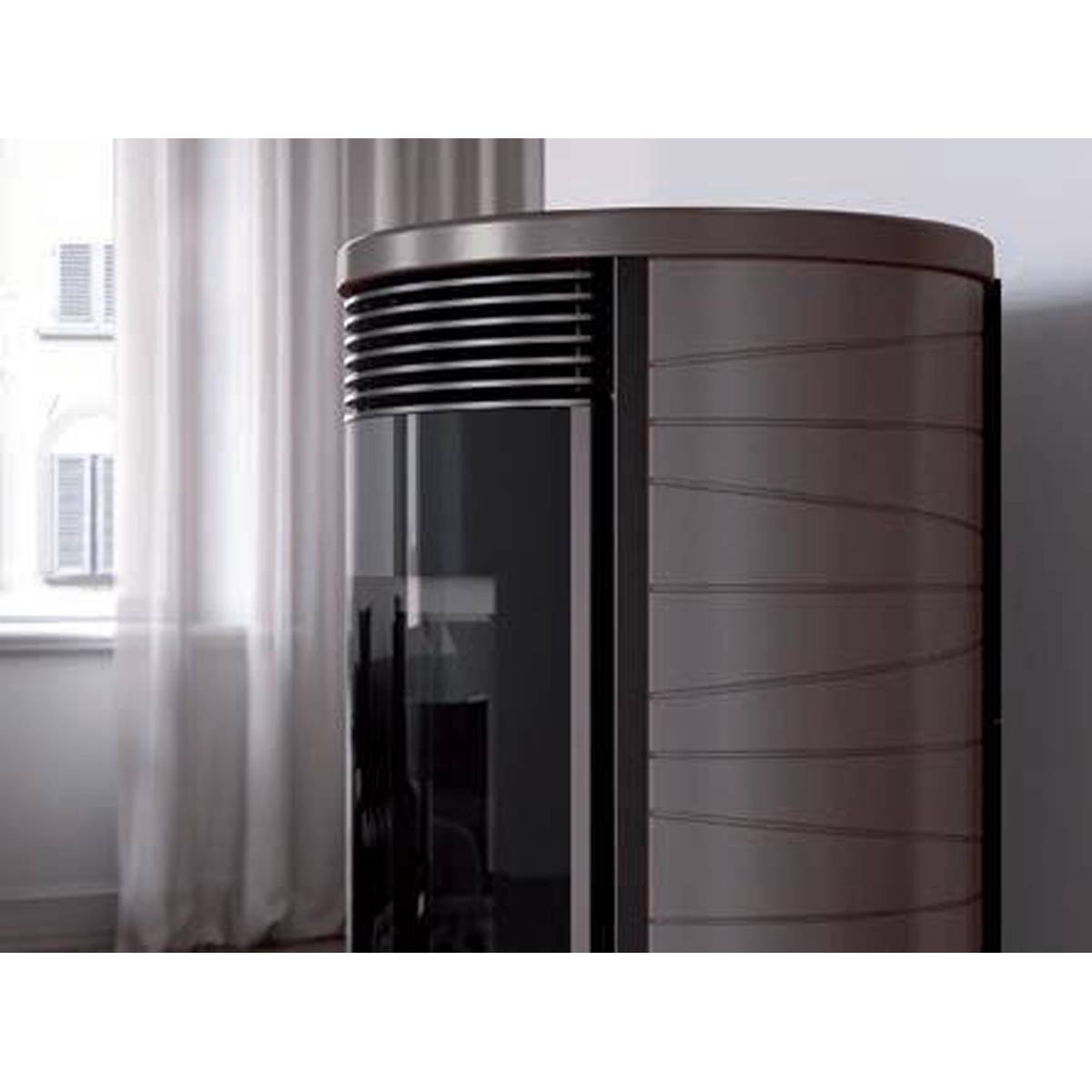 Stufa a pellet da 9 kW con ventilazione SMART silenziosa, rivestimento in maiolica e vetro curvo nero. Ideale per ambienti fino a 103 mq.